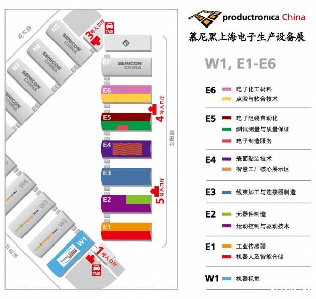 展馆分布 展品范围涵盖整个电子制造产业链,包括SMT表面贴装技术、线束加工和连接器制造、系统级封装、电子制造自动化、工业机器人、运动控制、点胶注胶、焊接、电子和化工材料、EMS电子制造服务、测试测量、PCB制造、电磁兼容、元器件制造(绕线机、冲压、灌装、涂敷、分选、打标等)和组装工具等。 展会地址 展会名称:慕尼黑上海电子生产设备展 展会时间:2021年3月17-19日 展位号:E6馆 6352 详细地址:上海新国际博览中心(龙阳路2345号)