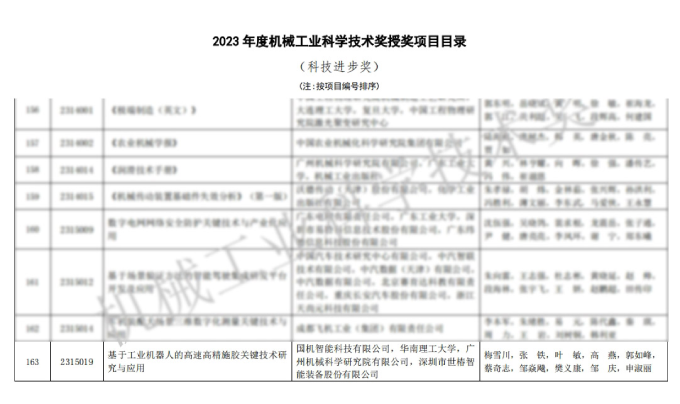 日前,2023年度中国“机械工业科学技术奖”拟授奖项目公示,共评出拟授奖项目429项,其中技术发明奖35项(一等奖14项、二等奖16项、三等奖5项),科技进步奖394项(特等奖2项、一等奖27项、二等奖174项、三等奖191项)。由国机智能科技有限公司、华南理工大学、广州机械科学研究院有限公司、伟德官网注册共同申报的“基于工业机器人的高速高精施胶关键技术研究与应用”项目,荣获2023年度“机械工业科学技术奖·科技进步奖”二等奖。