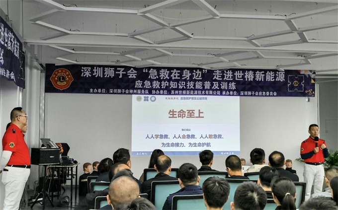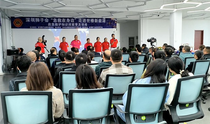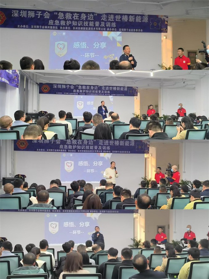 时军伟狮兄,张晓亮狮姐,雷高清狮兄分别为本次活动致辞。时军伟狮兄对深圳狮子会各位领导和狮友们的远道而来表示热烈的欢迎和感谢,对“急救在身边”项目的公益服务给予了高度认可!他希望以这场活动为契机,把深圳狮子会在急救等方面的专业知识和技能带到苏州新能源并不断推广延伸。他要求参加培训的新能源职工认真学习,积极互动,全面提升应急救护技能,为社会的安全和进步贡献更多力量,让爱传递,让温暖延续,为生命添彩!