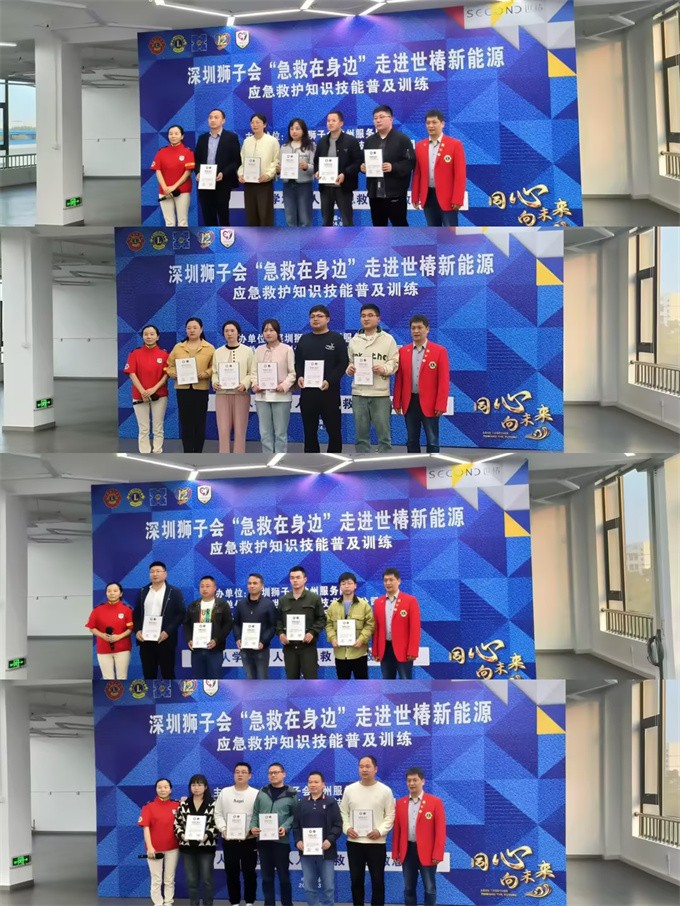 深圳狮子会神州服务队2023-2024年度队长张晓亮狮姐,深圳狮子会应急委员会2023-2024年度主席雷高清狮兄,深圳狮子会信兴服务队兼应急委员会执行主席陈政狮兄,深圳狮子会南海服务队兼应急委员会执行主席雷四成狮兄,深圳狮子会神州服务队2023-2024年度第二副队长张广军狮兄,深圳狮子会合一服务队2023-2024年度第二副队长刘安迪狮姐,深圳狮子会泰安服务队2023-2024年度第二副队长吴香雅狮姐,深圳狮子会神州服务队2023-2024年度财务长、董事长时军伟狮兄,以及深圳狮子会各服务队狮兄狮姐等出席本次培训活动。新能源50余名学员通过培训考核顺利结业。