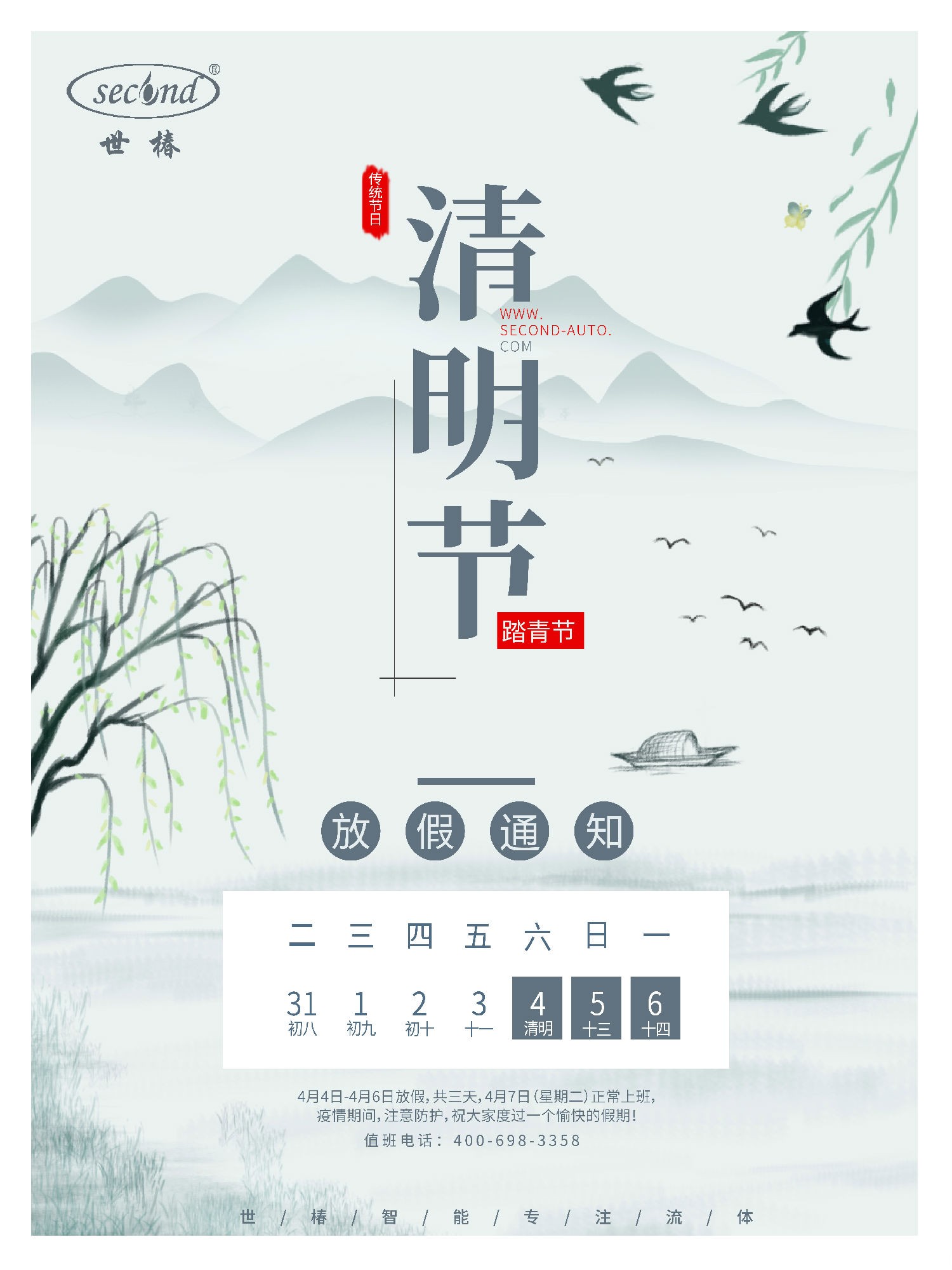 清明节将至,根据《国务院办公厅公布2020年放假安排》,并结合公司的实际情况,2020年清明节放假时间如下:4月4日至6日放假,共3天,4月7日(星期二)正常上班。疫情期间,务必注意个人防护,祝大家度过一个愉快的假期。